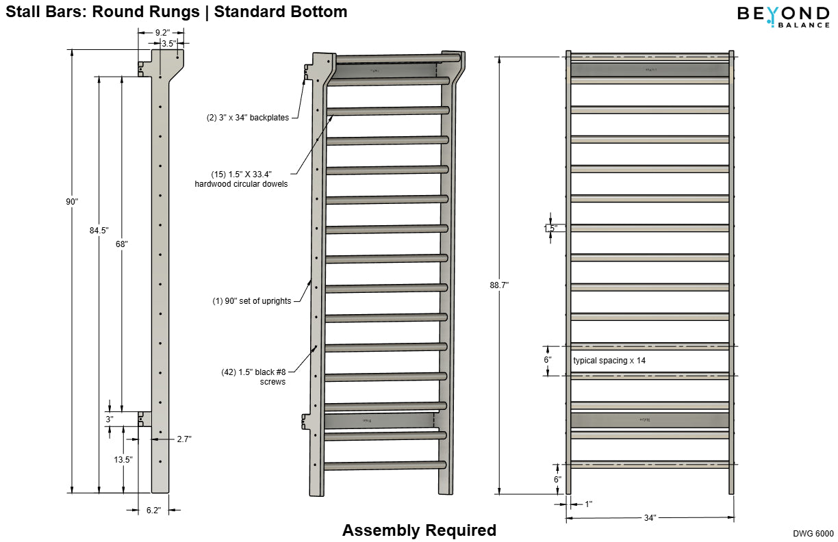 - Pilates Design -The traditional space saving design is 90'' tall x 34" wide. Our Pilates wall bars feature furniture-grade, high-strength Baltic Birch uprights with 16 round hardwood rungs on 6.0" centers or 14 oval rung on 6.675" centers.
